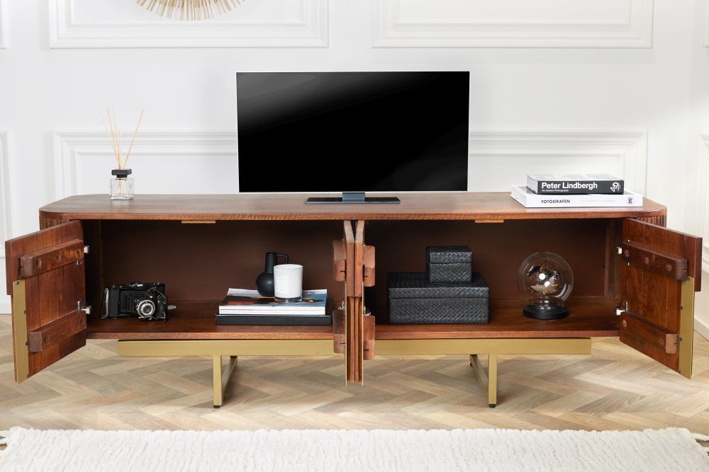 TV stolić koji utjelovljuje suptilan šarm prošlih vremena, savršeno usklađujući modernu funkcionalnost s retro estetikom. Ovaj televizijski stolić, s dimenzijama od 160 cm x 50 cm x 42 cm, nudi prostrano mjesto za smještaj vašeg televizora i medijskih uređaja, istovremeno obogaćujući prostor svojom prisutnošću.