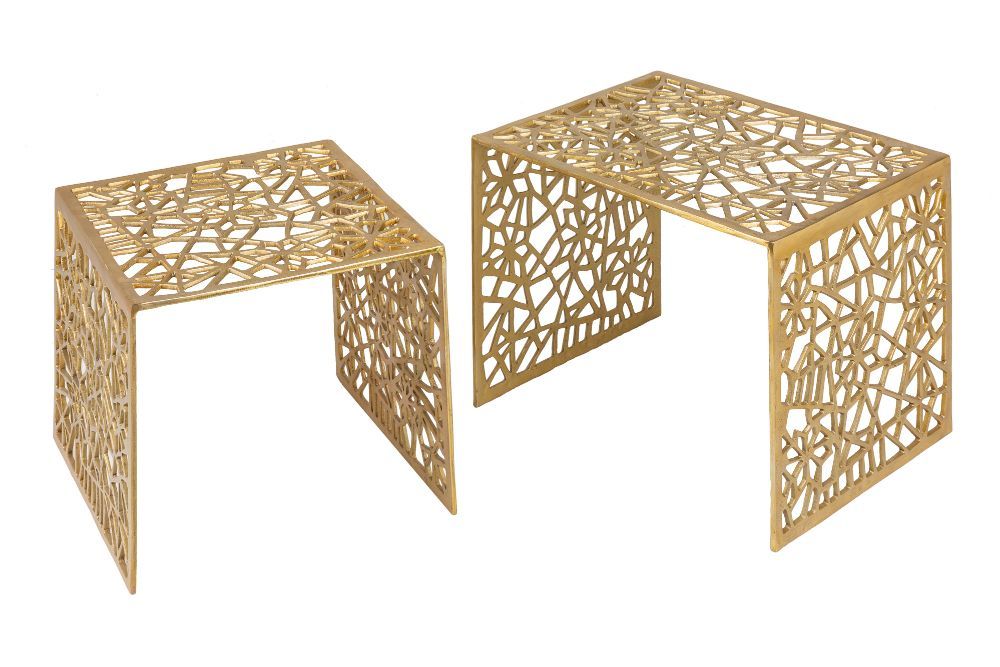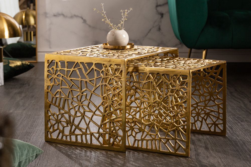 U središtu dnevnog boravka, u elegantnom okruženju obojenom smaragdnim tonovima i mramornim detaljima, nalazi se prekrasan stolić koji odmah privlači poglede. Izrađen s nevjerojatnom pažnjom i majstorstvom, ovaj stolić je pravi primjer spoja funkcionalnosti i umjetnosti. Stolić se sastoji od dva dijela, savršeno usklađena u dimenzijama i dizajnu, izrađena od metalne aluminijske legure koja mu daje izdržljivost, a obojen u raskošnu zlatnu boju koja dodaje luksuz i sjaj svakom prostoru. Veći stol ima dimenzije otprilike 50 cm širine, 40 cm visine i 39 cm dubine, dok je manji stol nešto kompaktiji, sa 39 cm širine, 36 cm visine i također 39 cm dubine. Ono što posebno plijeni pažnju su detaljno izrađene, izrezbarene šupljine koje krase sve površine stolića. Ove šupljine su rezultat pažljive ručne obrade, pri čemu je svaki uzorak pažljivo osmišljen i izveden, stvarajući dojam nježne mreže ili mozaika inspiriranog prirodom. Svaka linija, svaki oblik, priča svoju priču, povezujući se u jedinstvenu cjelinu koja odiše skladom i elegancijom. Zlatna boja stolića reflektira svjetlost na način da prostorija izgleda toplije i prostranije, dok složenost uzoraka stvara zanimljive sjene na podu, dodajući dodatni sloj vizualne dinamike. Na vrhu većeg stola nalazi se mala keramička vaza, koja svojom jednostavnošću i bijelom bojom pruža savršen kontrast bogatstvu zlatnih tonova i složenosti dizajna stola. Ovaj stolić nije samo komad namještaja; on je pravi umjetnički izraz, simbol majstorstva i pažnje prema detaljima. U njemu se susreću tradicija ručnog rada i suvremeni dizajn, stvarajući savršen balans između starog i novog, klasičnog i modernog. Bez obzira na to gdje se nalazi, ovaj stolić je sigurno središnji element svake prostorije, donoseći sa sobom dozu luksuza, elegancije i umjetničke ljepote.