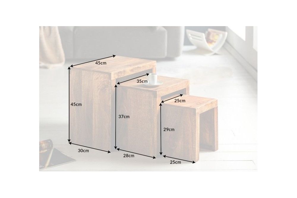 Ukrasni stolić "Trilogia Naturale" postaje srce i duša prostora, spajajući funkcionalnost i estetsku privlačnost u savršenoj harmoniji. Ovi stolići, izrađeni od masivnog mangovog drveta, pričaju priču o prirodi, zanatstvu i jednostavnoj eleganciji. Dimenzije i Prostor Set od tri stolića pruža fleksibilnost i praktičnost. Najveći stol, s dimenzijama 45 cm x 45 cm x 30 cm, predstavlja čvrstu bazu, dok srednji stol, veličine 35 cm x 37 cm x 28 cm, te najmanji, 25 cm x 29 cm x 25 cm, savršeno nadopunjuju cjelinu. Njihova prilagodljivost omogućava jednostavno sklapanje jednog u drugi, čime se štedi prostor i omogućava različite konfiguracije prema potrebama i prilikama. Materijali i Izrada Stolići su izrađeni od masivnog, lakiranog mangovog drveta, čime se naglašava prirodna ljepota i jedinstvenost svakog komada. Mangovo drvo poznato je po svojoj izdržljivosti i bogatoj teksturi, koja donosi toplinu i prirodan šarm u svaki dom. Zbog ručne izrade i prirodnog materijala, svaki stol je jedinstven, s mogućim varijacijama u boji i blagim neravninama koje samo dodaju njegovom karakteru i autentičnosti. Boje i Teksture Prirodna boja drveta dominira ovim stolićima, ističući njihov organski izgled i osjećaj povezanosti s prirodom. Topla, zemljana nijansa drveta stvara ugodan ambijent, dok glatka, lakirana površina pruža zaštitu i sjaj, istovremeno otkrivajući prekrasne prirodne uzorke i godove drveta. Funkcionalnost i Svestranost Ovi stolići nisu samo ukrasni; oni su izrazito funkcionalni i mogu se koristiti kao stolići za kavu, pomoćni stolići ili čak kao samostalni komadi u različitim prostorijama. Njihova sposobnost sklapanja jedan u drugi čini ih idealnima za male prostore, omogućavajući jednostavno skladištenje kada nisu u upotrebi. Zaključak Ukrasni stolići od mangovog drveta predstavljaju savršen spoj prirode i umjetnosti, donoseći toplinu, eleganciju i funkcionalnost u svaki dom. Njihova jedinstvena izrada i prirodne varijacije čine ih posebnima, svaki sa svojom pričom i karakterom. Bilo da su smješteni u dnevnom boravku, spavaćoj sobi ili hodniku, ovi stolići zrače prirodnom ljepotom i jednostavnošću, podsjećajući nas na važnost povezanosti s prirodom i rukotvorinama koje unose dušu u naš svakodnevni život.