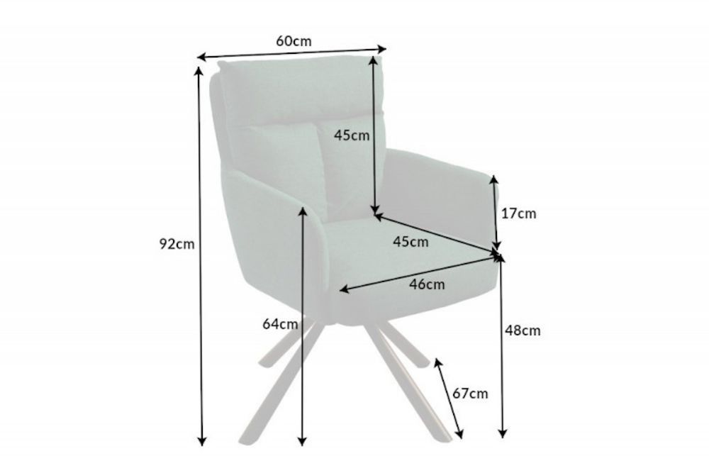 Dimenzije stolice, 59 cm širine, 92 cm visine i 67 cm dubine, omogućavaju da se lako uklopi u različite prostore, od kućnog ureda do blagovaonice ili dnevnog boravka. Sjedeći dio, dimenzija 43 cm u širinu, 51 cm u visinu i 45 cm u dubinu, oblikovan je tako da pruži maksimalnu udobnost, dok ergonomski dizajn omogućava prirodan položaj tijela, čineći sjedenje ugodnim čak i tijekom dužih vremenskih perioda. Nasloni za ruke, visoki 66 cm, dodaju dodatni sloj udobnosti, omogućujući opuštanje i podršku.