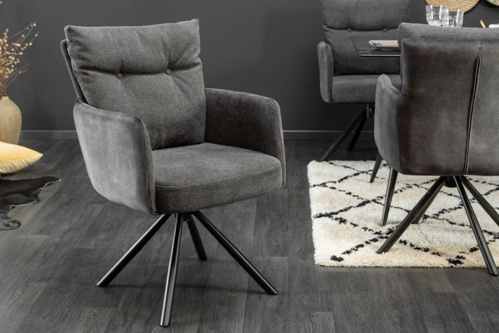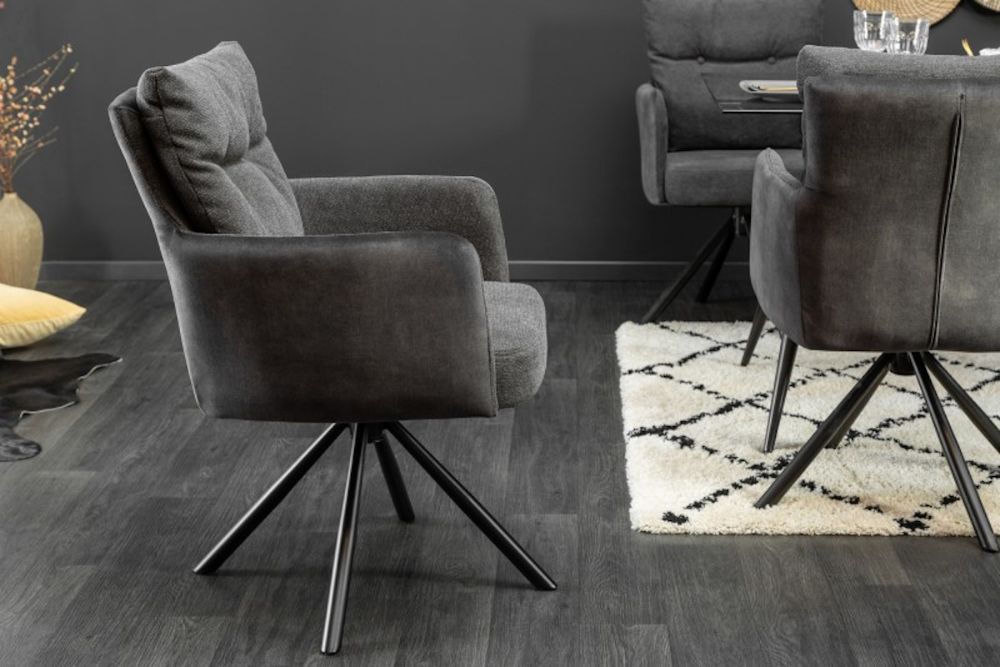 Ova elegantna okretna stolica donosi kombinaciju moderne funkcionalnosti i vrhunske udobnosti. Presvučena u prefinjenu tkaninu antracitne nijanse, stolac zrači sofisticiranim industrijskim stilom, idealnim za suvremene interijere. Njegovo ergonomsko sjedalo i udobni nasloni za ruke pružaju maksimalnu podršku, dok okretni mehanizam omogućava potpunu slobodu kretanja i fleksibilnost u radnom prostoru. Metalna baza osigurava stabilnost, dok čiste linije dizajna naglašavaju suvremenost ovog komada. Ovaj stolac je savršen za sve koji traže spoj dizajna, praktičnosti i udobnosti, bilo da ga koriste u uredu ili blagovaonici.