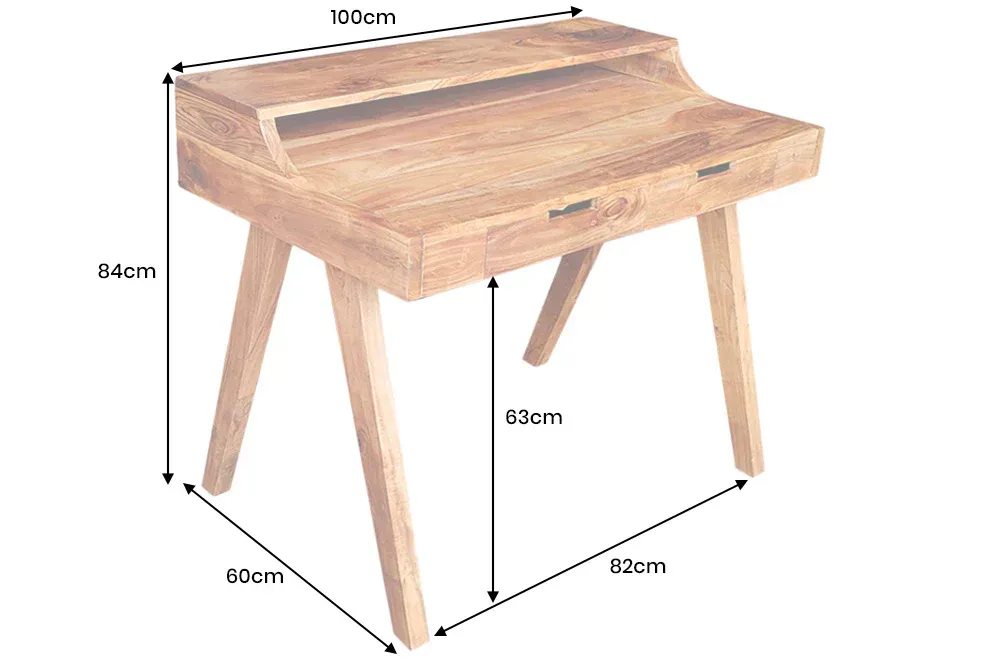 Njegove dimenzije – širina 100 cm, dužina 60 cm i visina 84 cm – pružaju idealan balans između prostranosti i kompaktnosti. Blago zakrivljeni rubovi i podignuti stražnji dio stola unose dozu sofisticiranosti, dok otvorena polica (95x9x23 cm) diskretno pruža prostor za odlaganje knjiga i sitnica. Dvije elegantno ukomponirane ladice (31x5x34 cm) omogućuju urednost i organizaciju, a čvrste, ukošene noge daju stabilnost i čine stol vizualno dinamičnim.
